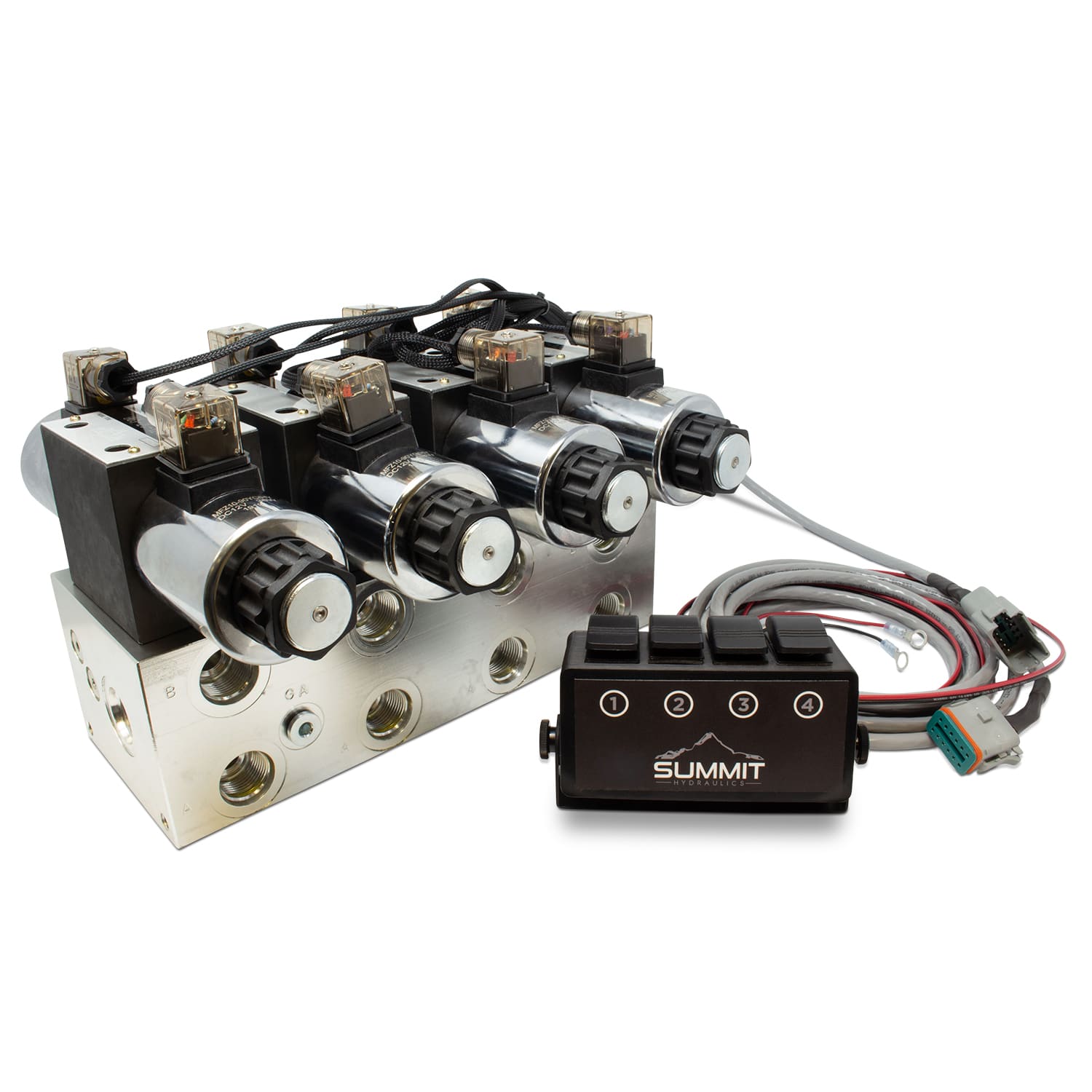 Esta válvula de control hidráulica de doble efecto controla el flujo de fluido hidráulico de entrada/salida de un cilindro hidráulico o motor (dependiendo del tipo de carrete). Estas válvulas añaden funciones hidráulicas auxiliares adicionales o sustituyen a una válvula de control hidráulico actual. Funciona como una configuración de cuatro estaciones, de centro abierto y en serie.