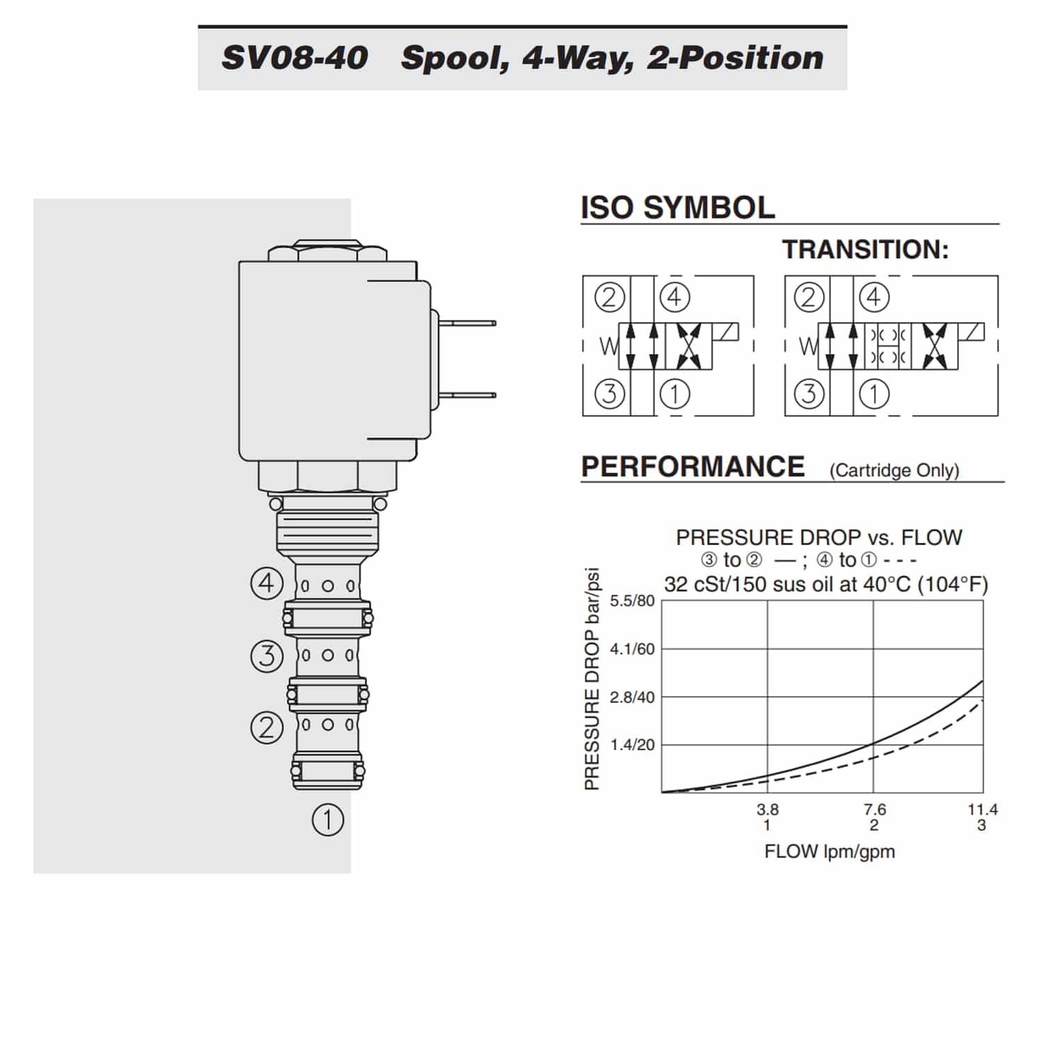 Cuando está sin corriente, el SV08-40 permite el flujo entre 3 y 2, y entre 4 y 1.