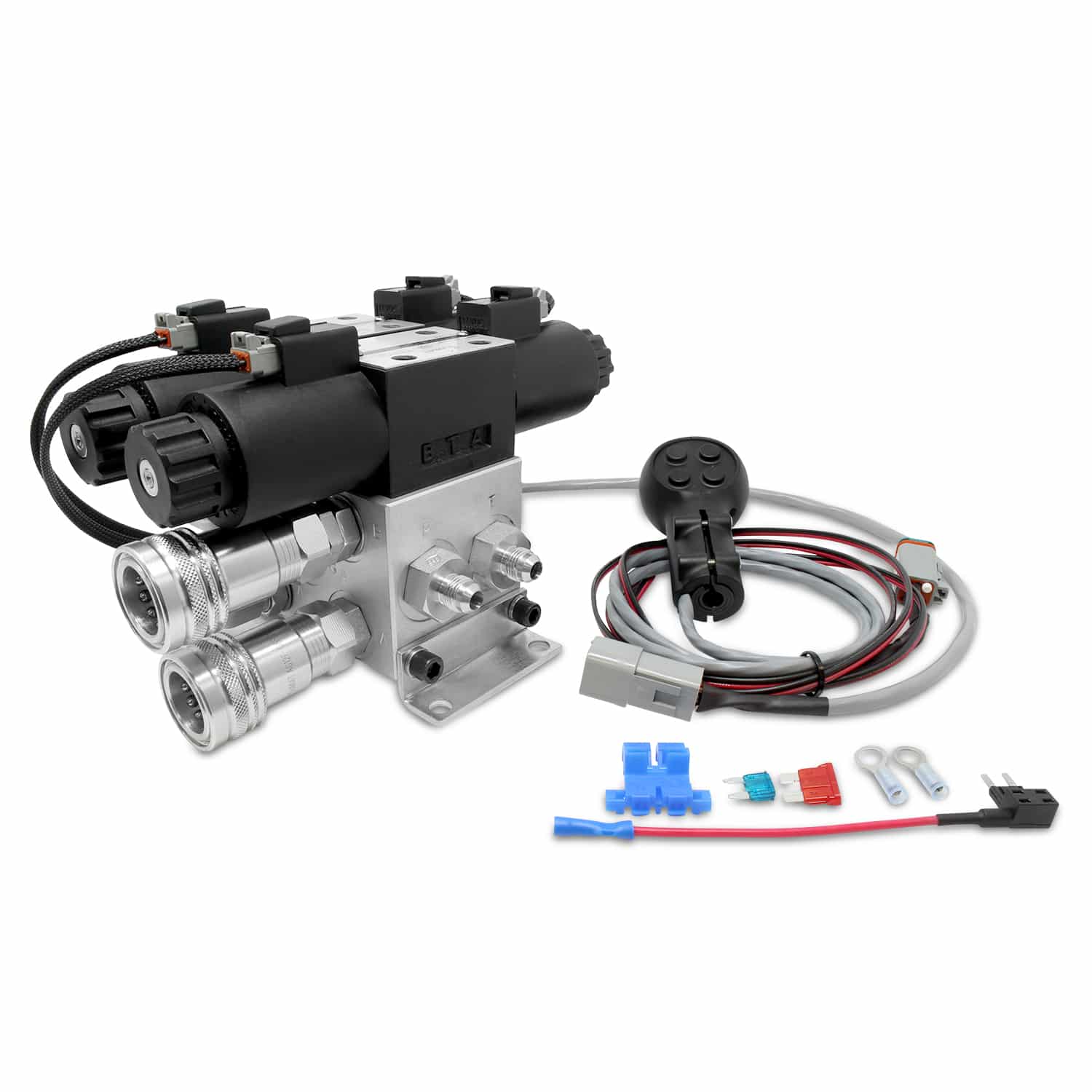 Este todo-en-uno Kioti kit remoto trasero con función delantera 3ª está diseñado para instalar en su tractor compacto Kioti CS2520, CS2220 Tractores de la serie (con el kit Power Beyond instalado) para añadir conexiones remotas traseras y una tercera función. Esto le permite controlar fácilmente varios implementos hidráulicos en la parte delantera y trasera utilizando nuestro joystick Summit Hydraulics y/o los controles de la caja de interruptores. Puede añadir dos, tres o cuatro conjuntos de acopladores remotos traseros a su máquina y una tercera función en la parte delantera.