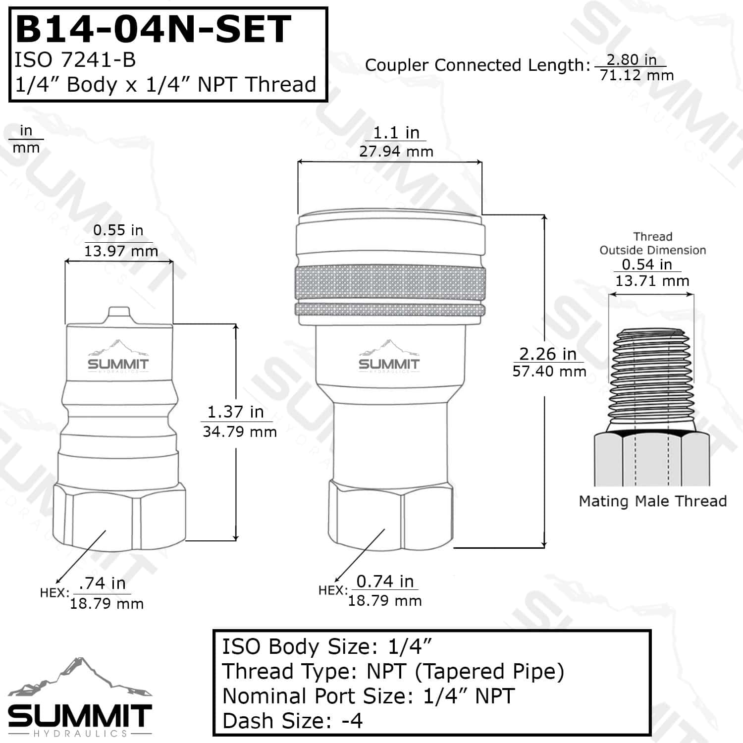 The ISO 7241 B Series of quick disconnect couplers are used on a large spectrum of hydraulic applications with strenuous quality standards such as the aerospace, automotive, electronics industries. They are also recommended for general purpose, machine tools, mobile hydraulics, and other equipment applications. Our Series B couplers are interchangeable with all ISO 7241 B series couplings.