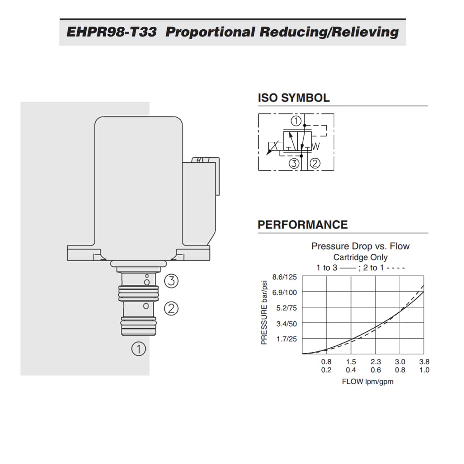 When the coil is energized, 2 is connected to 1. Increasing current applied to the coil will increase the control (reduced) pressure proportionally. If pressure at 1 exceeds the setting induced by the coil, pressure from 1 is relieved to 3.