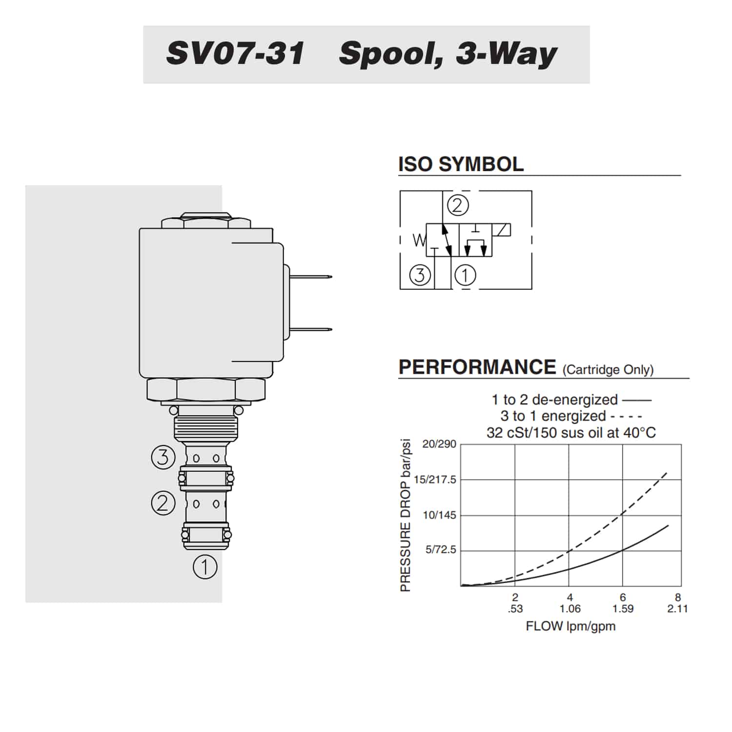 When de-energized, the SV07-31 allows flow from 2 to 1 while blocking flow at 3.