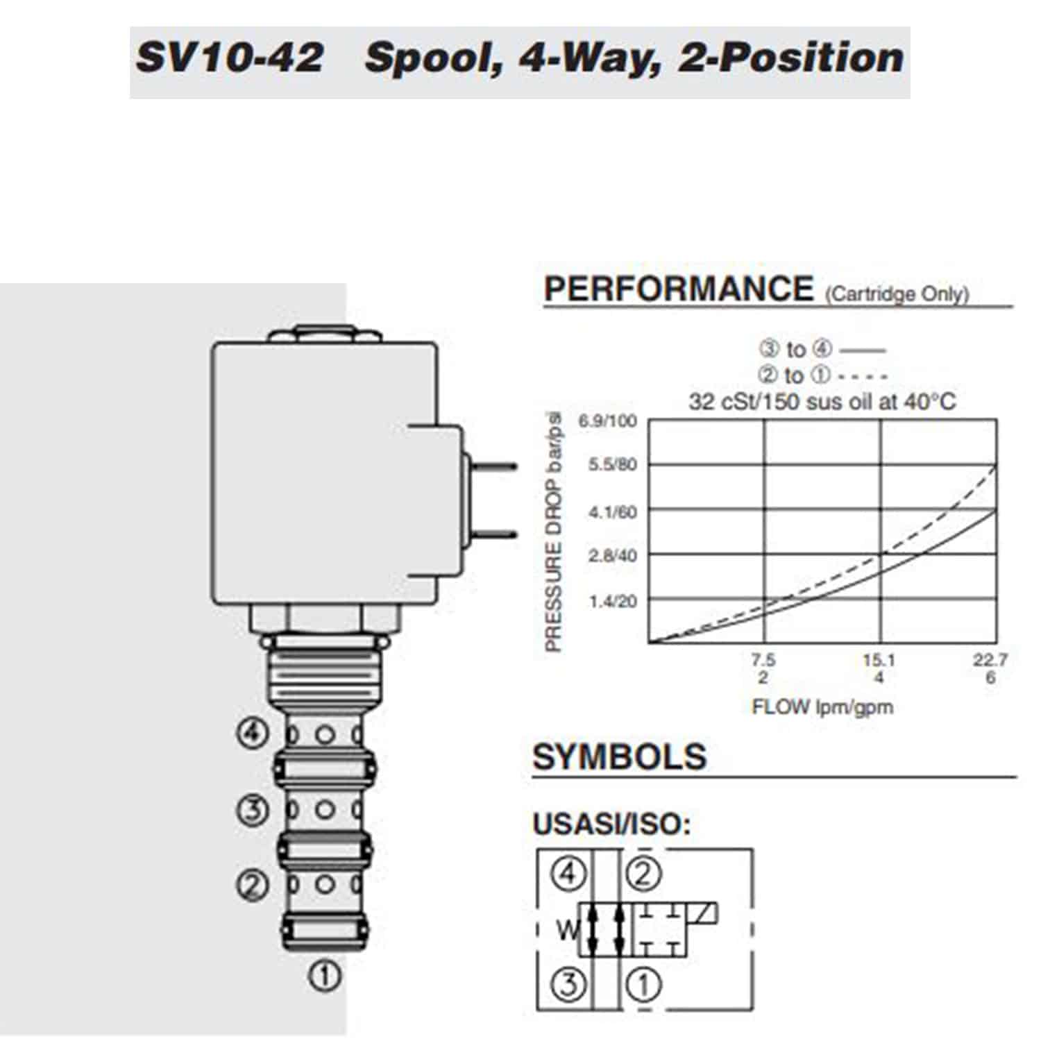 When de-energized, the SV10-42 allows flow between 3 and 4, and between 2 and 1. When energized, the spool shifts to block flow at all ports.