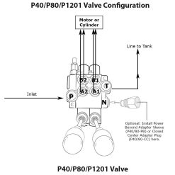 This valve uses a pressure line (Inlet), tank line (outlet), work ports (A/B ports that go to hydraulic cylinder or motor), and optional power beyond port (N Port, used to connect valves downstream). Some common examples of connecting this valve are shown below, however, it is possible to connect it in different configurations than shown.