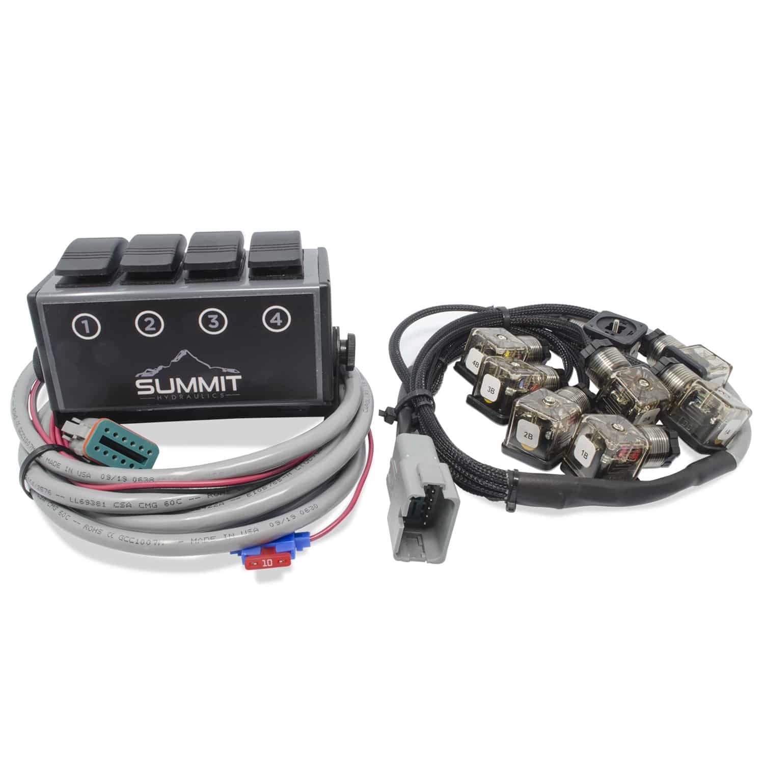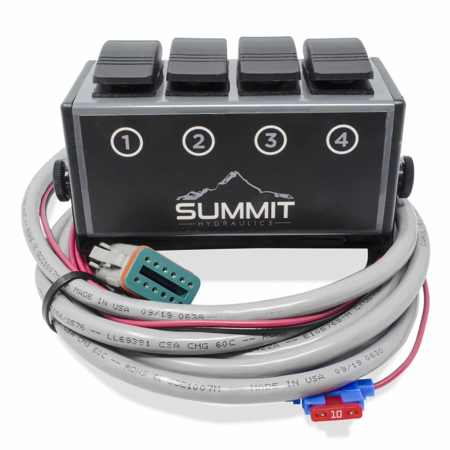 - 1 Switch Box with four momentary rocker switches and 36″ Harness