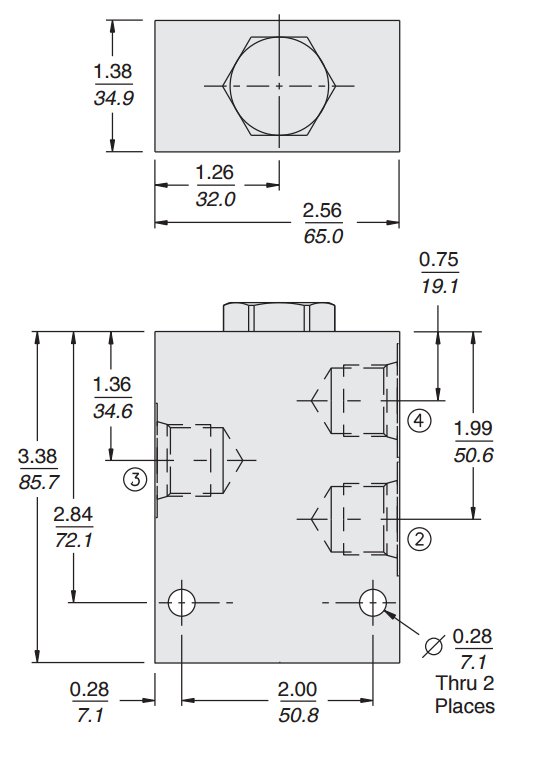 In the dividing mode, this flow divider will divert input flow from port 3 to ports 2 and 4, with a 50:50 ratio, regardless of operating pressure. When the flow direction is reversed the valve will combine flows from 2 and 4 to port 3. Synchronizing flow is provided in both the dividing and combining modes at “bottomed” conditions in cylinder applications and at “stalled” conditions in motor applications.